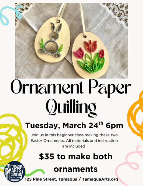 Join Marky Barto for a fun class to learn the basics of paper quilling! Create your very own colorful ornaments of Tulips and a Bunny.