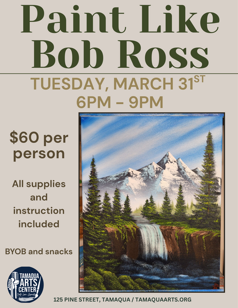 This relaxing Bob Ross inspired snow scene painting will allow you to unleash your creativity this December! Enjoy a morning of painting “happy little trees” with our talented instructor. Bring your friends, your favorite snacks, and your creativity to this fun-filled morning at the Tamaqua Arts Center!