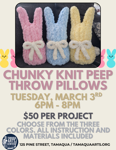 Ever wanted to made your own chunky knit pillow but don’t know how? Join us in this two hour class to make your own Chunky Hand Knit Peep Throw Pillow! Our instructor will guide you through the steps so you will leave with your new favorite Spring themed pillow. Seats are extremely limited so make sure to get your tickets as soon as possible.